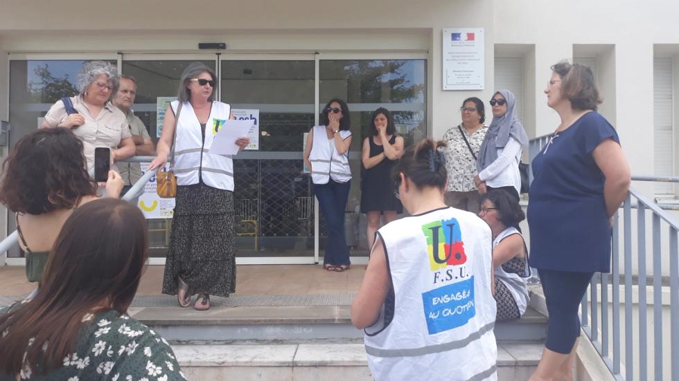 A 17h, heure de rendez-vous du rassemblement, les discussions allaient déjà bon train devant les marches de l’inspection académique. D’abord entre elles, puis en réponse à nos questions, les AESH présentes, toutes des femmes, racontent la réalité de leur métier. Les temps partiels subis de 21 heures, voire 24 heures par semaine pour certaines, ne permettent pas de prendre un second emploi de par l’amplitude horaire (8h30 – 17h en école primaire). Il est parfois possible de faire quelques heures de remplacement en cantine, mais elles n’en sont informées que le matin même, ce qui ne permet pas de s’organiser en conséquence. A cela s’ajoute le nombre d’heures allouées pour l'accompagnement des élèves qui n’augmente pas en proportion du nombre d’élèves à suivre. On regroupe alors les élèves en question dans une même classe avec un·e seul.e AESH, sans se préoccuper de la difficulté de gérer simultanément différentes formes de handicap. Enfin, les AESH se vivent comme la variable d’ajustement du manque de places dans les établissements spécialisés. Nadine Gasne raconte avoir déjà eu des bleus suite à des coups d’élèves qu’elle suit, ou encore l’exemple d’une collègue poussée dans les escaliers.