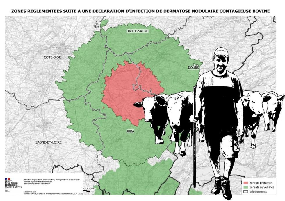 Jeudi 23 octobre, un nouveau foyer de dermatose nodulaire contagieuse bovine (DNCB) a été détecté à Chamblay. L'abattage total du lot est prévu vendredi 24 octobre.