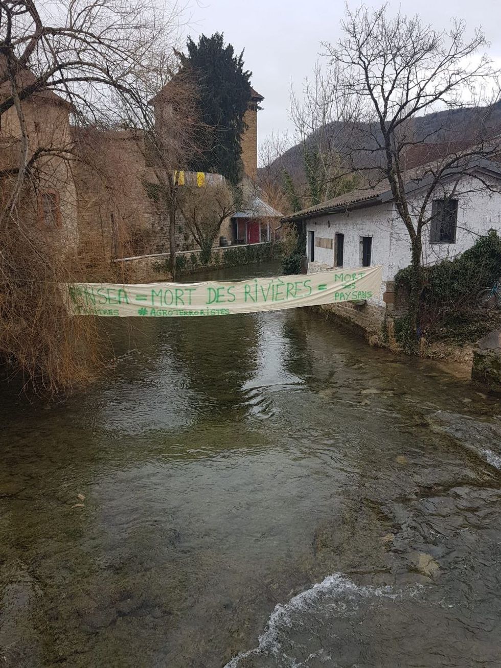 Une immense banderole blanche a enjambé dans la nuit la Cuisance pour rejoindre ses deux rives. En lien avec la crise agricole toujours aussi vive, il y était dénoncé les conséquences des dernières mesures prises par le gouvernement, en connivence avec le syndicat pro agro-industrie FNSEA.