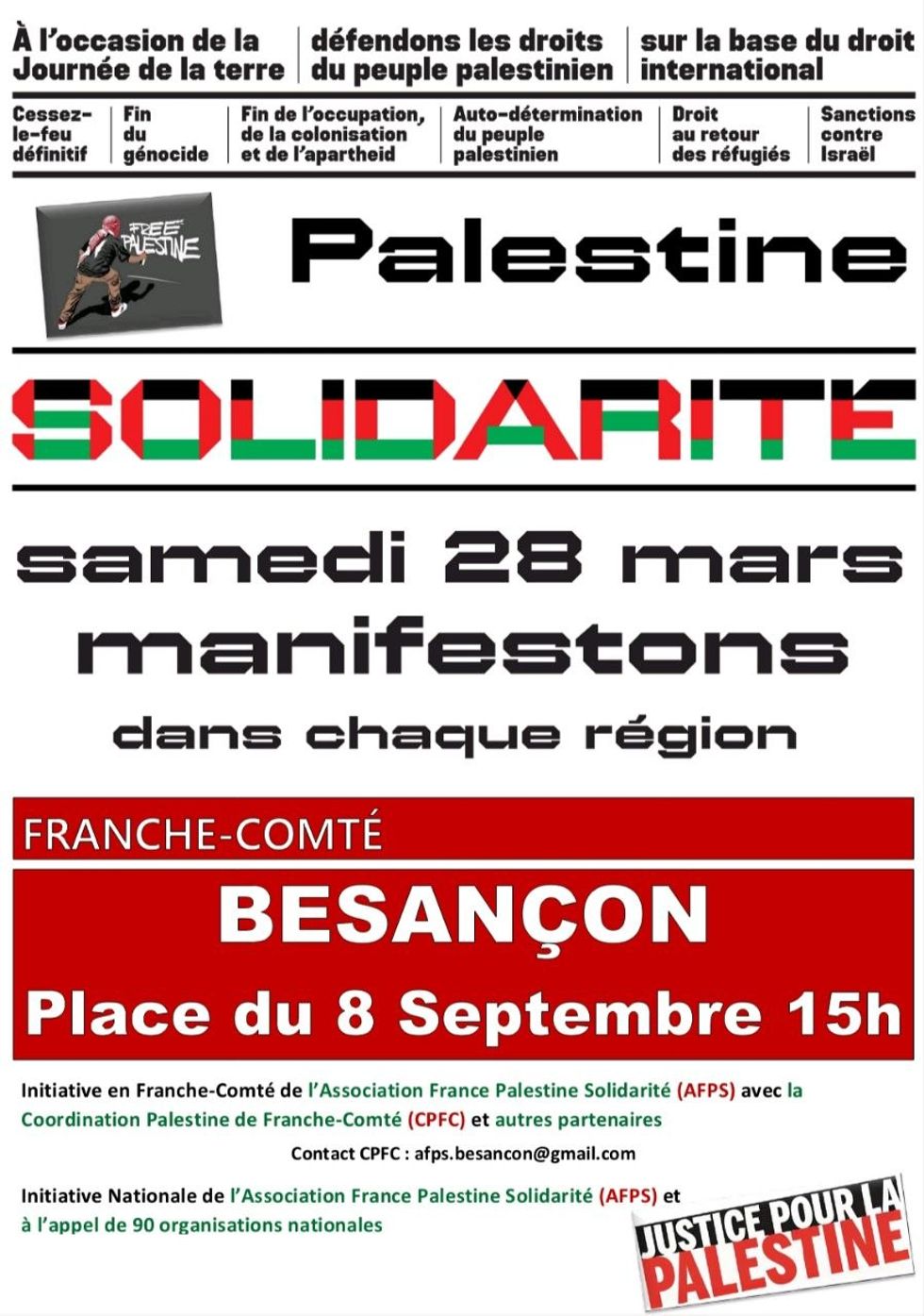 Pour la Franche-Comté, l’AFPS est à l’initiative avec la Coordination Palestine de Franche-Comté (CPFC) et à l’appel déjà de 40 organisations localement. À Besac comme dans toutes les régions de France, soyons nombreux à manifester notre Solidarité avec la Palestine et avec les Palestinien-nes !