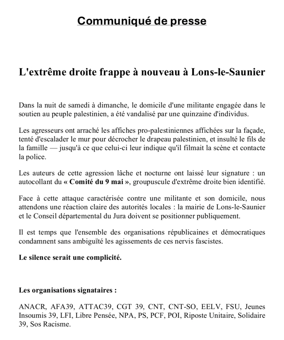 Agression d'une militante de la cause palestinienne à Lons-le-Saunier