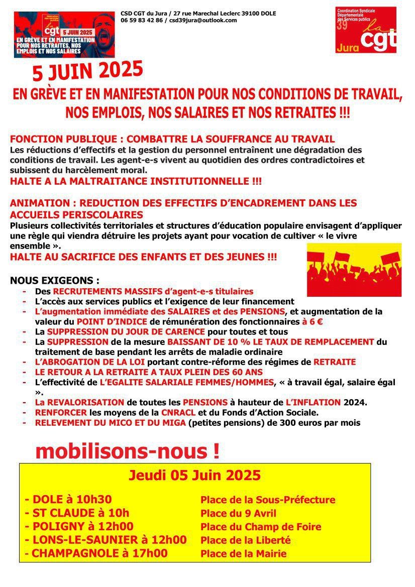 Nous appelons les agent·es et salarié·es à se mobiliser massivement le 5 juin 2025, dans toutes les initiatives, actions et manifestations organisées partout en France. Notre organisation est disponible pour toute négociation sur les revendications des personnels.