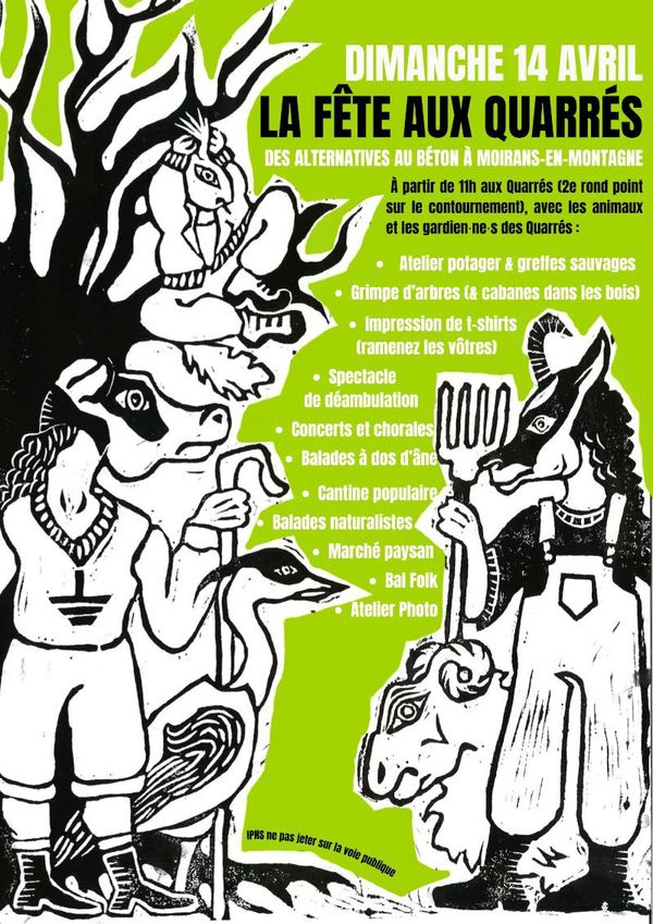 Dimanche 14 avril dès 11 heures -- 2e rond-point du contournement de Moirans-en-Montagne (39) -- Grande journée pour des jardins partagés et la sauvegarde des Quarrés. C’est notre action collective qui changera la donne. Nous allons sauvegarder l’espace naturel des Quarrés, maintenir la vocation agricole de ses prés, et y faire naître ces jardins partagés.