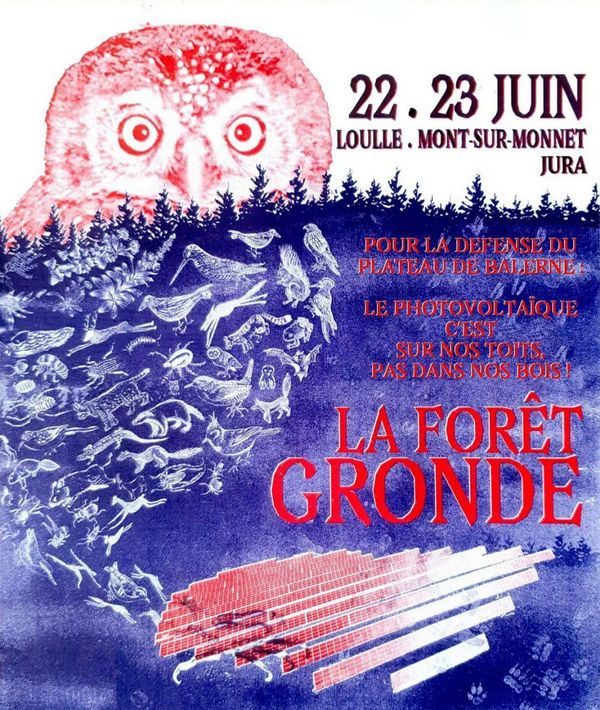 Le 22 et 23 juin, nous défendrons les forêts du plateau de Balerne, entre Loulle et Mont-sur-Monnet (Jura). Le samedi, balades et actions naturalistes, tables rondes sur la "transition" énergétique et sur les plus de 25 projets de parcs photovoltaïques au sol. Dimanche, descente symbolique des panneaux photovoltaîques du plateau de Balerne et grande manifestation de Ney à Champagnole.