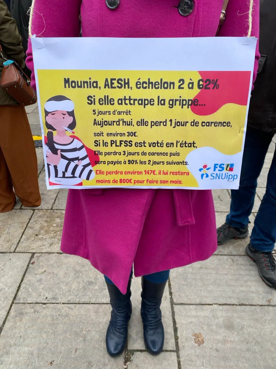 Militante: Les AESH ont un statut extrêmement précaire dans l’Éducation Nationale ; ce sont des personnels qui ne sont pas du tout reconnus en tant que professionnels et pourtant l’école sans elles s’effondre parce que l’inclusion scolaire des enfants en situation de handicap ne se fait pas sans elles ; je dis « elles » car c’est une profession extrêmement féminisée ; ces jours de carence, c’est la double peine, c’est vraiment une honte.