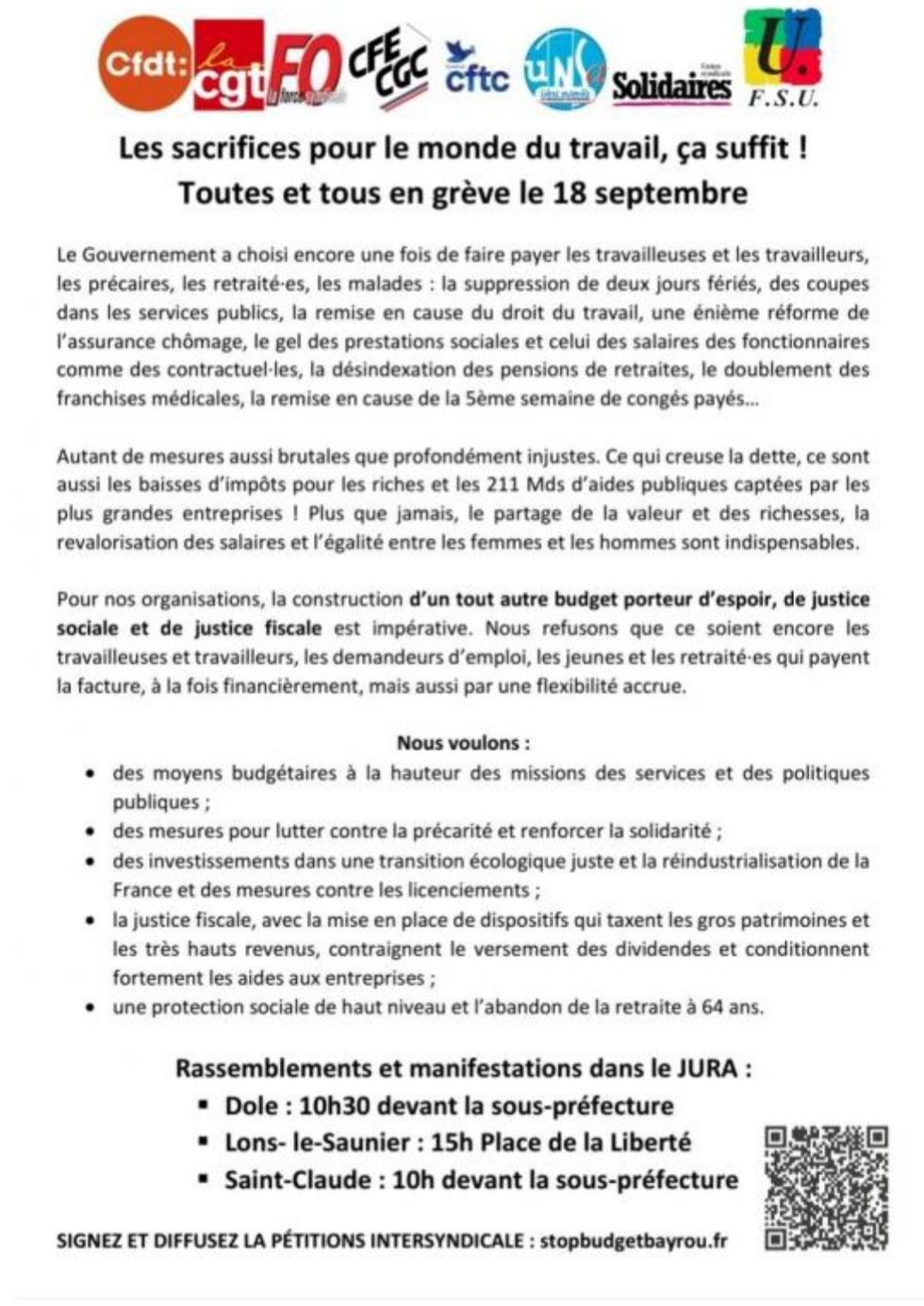 Jeudi 18 septembre : Mouvement de grève à l'initiative de l'intersyndicale.