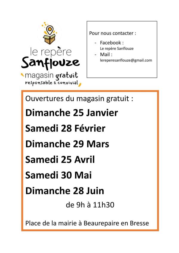 Dates d'ouverture de la boutique éphémère Le Repère Sanflouze à Beaurepaire-en-Bresse, place de la Mairie de 9h à 11h30: